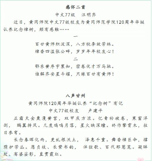 校友代表卢建平先生深情表示:“我们是恢复高考后的第一届学生,是黄师给了我们改变命运机会。这棵香樟树,是我们全班同学集体情感的寄托。今天,我们共同认养它,以此表达我们对母校最诚挚的祝福:祝愿文学根脉永续,母校基业长青!”校友汪明齐为活动赋诗二首,作为纪念。